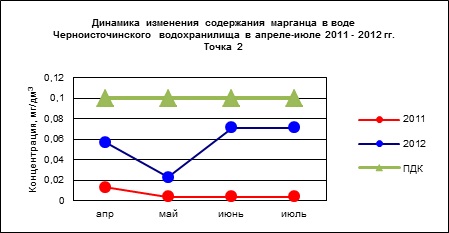 Рис. 6 – динамика изменения концентрации марганца в воде Черноисточинского водохранилища за апрель-июль 2011 – 2012 гг.